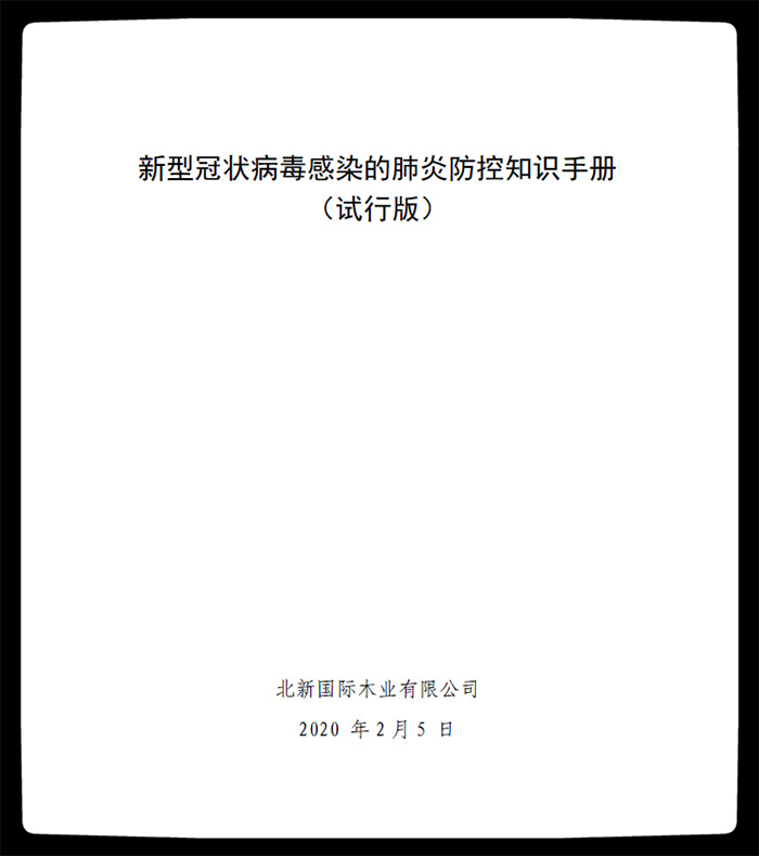 按照党中央疫情防控工作总体要求,积极做好疫情防控宣传指导,编制《北新木业新型冠状疫病病毒感染的肺炎防控知识手册(试行版)》,并通过微信公众号,微信群等平台,第一时间发布疫情防控政策和科学防护知识,对员工做好疫情防控专项培训,引导员工正确认识疫情,增强抗击疫情信心。