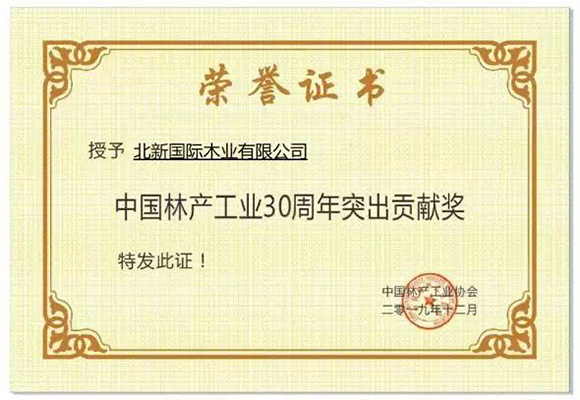 2019年,北新木业在参与组建多个行业创新联盟,制定行业国家标准等方面作出了突出贡献,荣获“中国木业改革开放领军企业”、“中国林产工业30周年突出贡献奖”、“无醛人造板国家创新联盟发起单位”等称号。