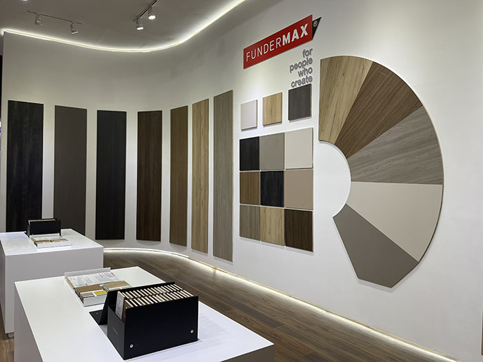 上百种花色,每种花色还可变幻出各种不同饰面效果,不管是哑光、高光、RKP4超哑肤感、木纹,还是零度、深浅浮雕等等,FunderMax都可以完美展示其表面效果,深受参观者的喜爱。