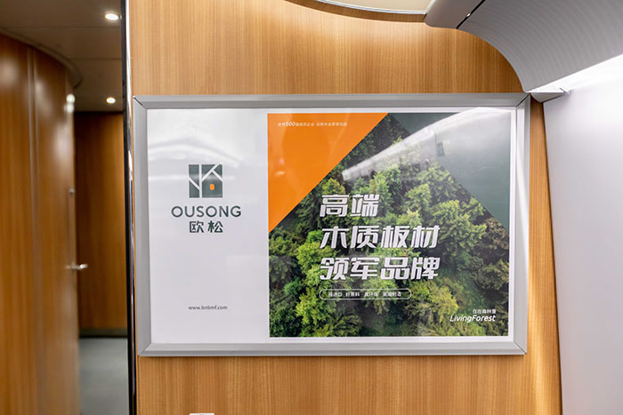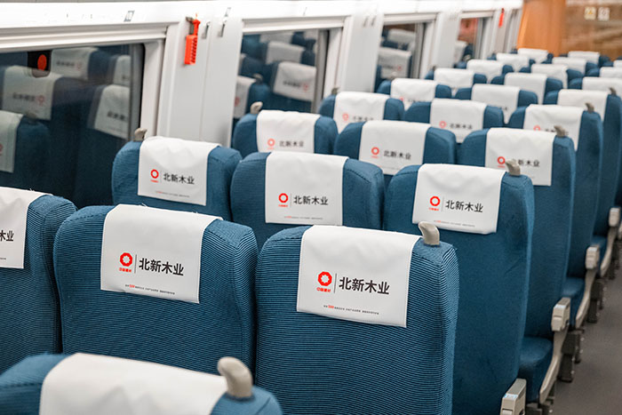 列车上,车身彩贴“北新木业 木材构筑未来”的口号大气醒目;车内头片、桌贴、海报、品牌天幕等媒体形式交织展示北新木业主打品牌“欧松®”的主要产品和品牌风采,营造浓厚的品牌主题氛围。