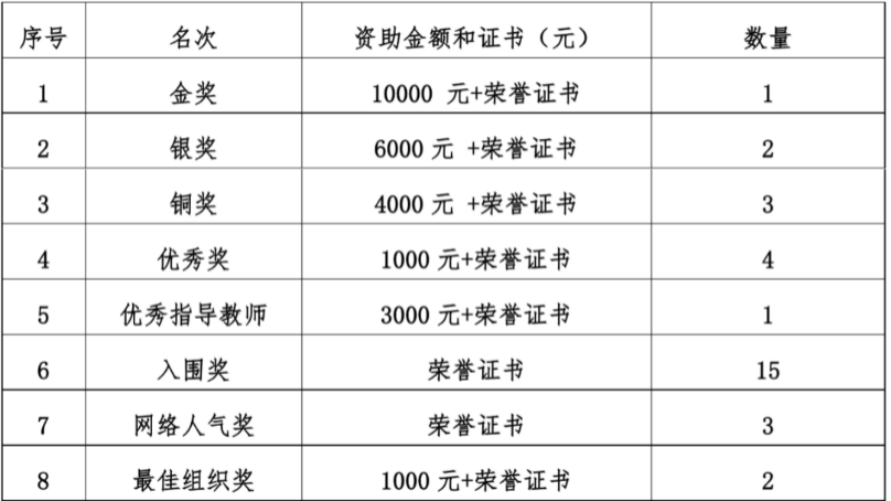 初赛环节将从所有参评作品中,通过专家评审选拔15件入围作品,授予入围证书。入围作品以网络投票结合专家评审委员会评议的形式,最终确定金奖1名,银奖2名,铜奖3名,优秀奖4名;同时还颁发出优秀指导教师1名,入围奖15名、网络人气奖3名、最佳组织奖2名,并给予相应的奖金和证书,具体金额标准如下: